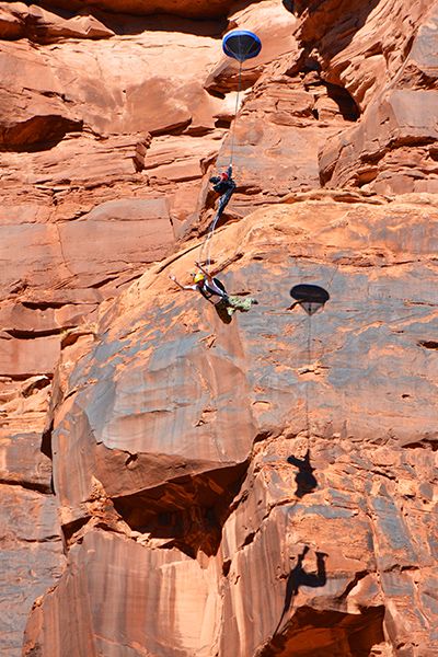 But, back to the deep setting: the reason a deeper setting was discovered to be an advantage in BASE is because a parachute flies at a lower airspeed when brakes are applied. Now this might seem obvious, but hang on, it’s important that we cover the basics. Minimizing the forward speed of your parachute immediately after opening gives you time if, heaven forbid, your parachute should open facing the object that you just jumped from. In the event of an off-heading opening, the slower your parachute is flying, the more time you have to correct the heading. The more time you have to correct the heading, the better your chances are of not hitting the object. And if, heaven forbid, you do hit the object, you will hit the object with less speed. To recap: having more time to correct your heading is good. Not hitting the object is good.
